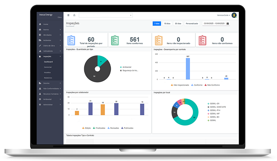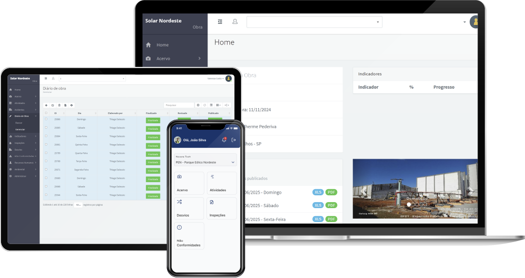 Ganhe agilidade no campo e visibilidade na gestão. Centralize diários de obra, inspeções, não conformidades, contratos, gestão de saúde e segurança do trabalho, prazos de licenças ambientais e controle de acesso à obra. Aplicativo funcionando online e offline para coleta em campo + sincronização e relatórios automáticos.